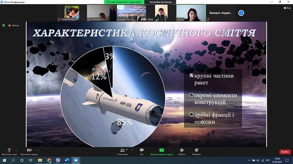 22-24 квітня 2021 року у місті Дніпро відбулась XІХ Всеукраїнська конференція-конкурс науково-дослідних робіт школярів «ЗОРЯНИЙ ШЛЯХ», організована Національним центром аерокосмічної освіти молоді ім. О.М. Макарова.