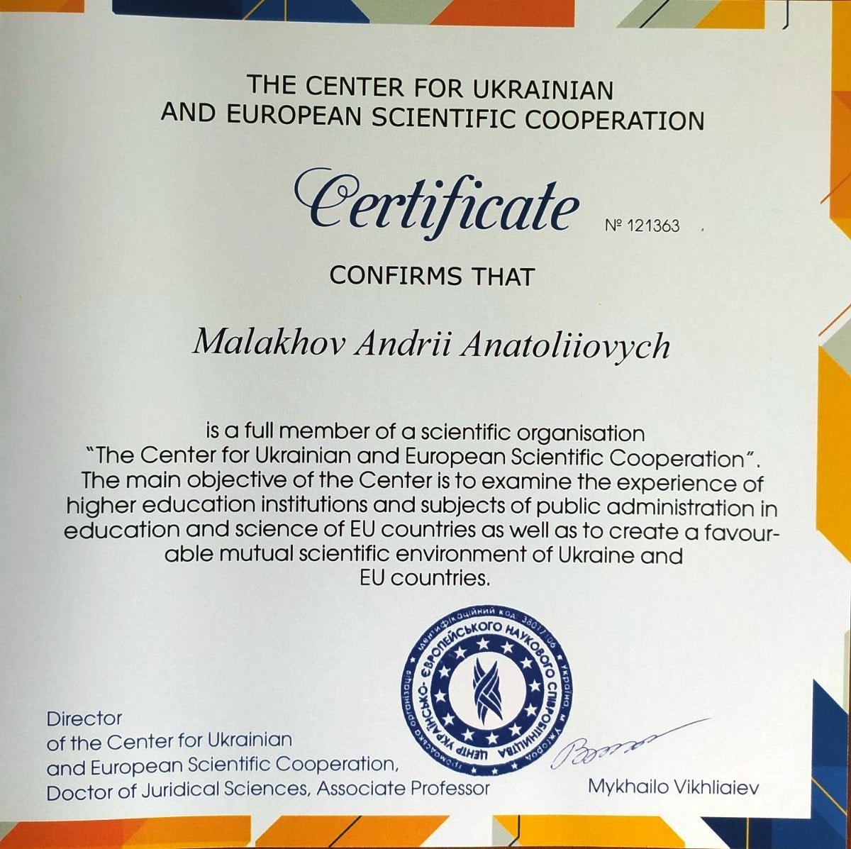 Директор Миколаївської школи № 57 імені Т.Г.Шевченка Андрій Анатолійович Малахов став дійсним членом наукової організації «Центр українсько-європейського наукового співробітництва».