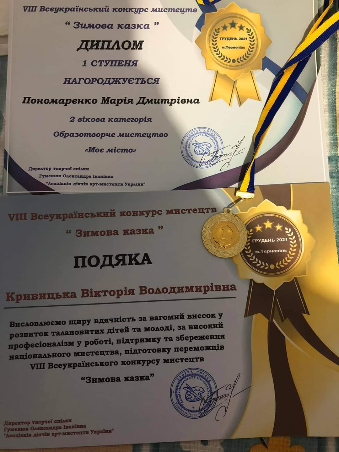 Вітаємо з І місцем у Всеукраїнському конкурсі мистецтв “Зимова казка” Марію Пономаренко – вихованку “Зразкового художнього колективу” гуртка “Клаптикова мозаїка” (керівник Вікторія Кривицька) БТДЮ Інгульського району.