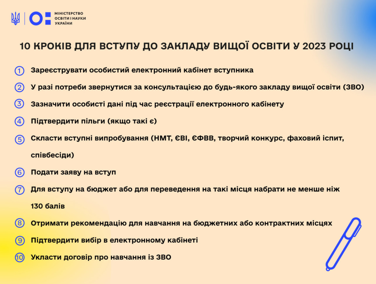 Попри воєнний стан в Україні триває активна підготовка до вступної кампанії у 2023 році. Зокрема, зареєстровано Порядки прийому на навчання для здобуття фахової передвищої та вищої освіти, демонстраційні варіанти тестів уже із семи предметів НМТ доступні на сайті УЦОЯО, а реєстрація для участі у тестуванні розпочнеться 3 квітня. Для допомоги вступникам МОН підготувало головні кроки, які допоможуть стати студентом у 2023 році: